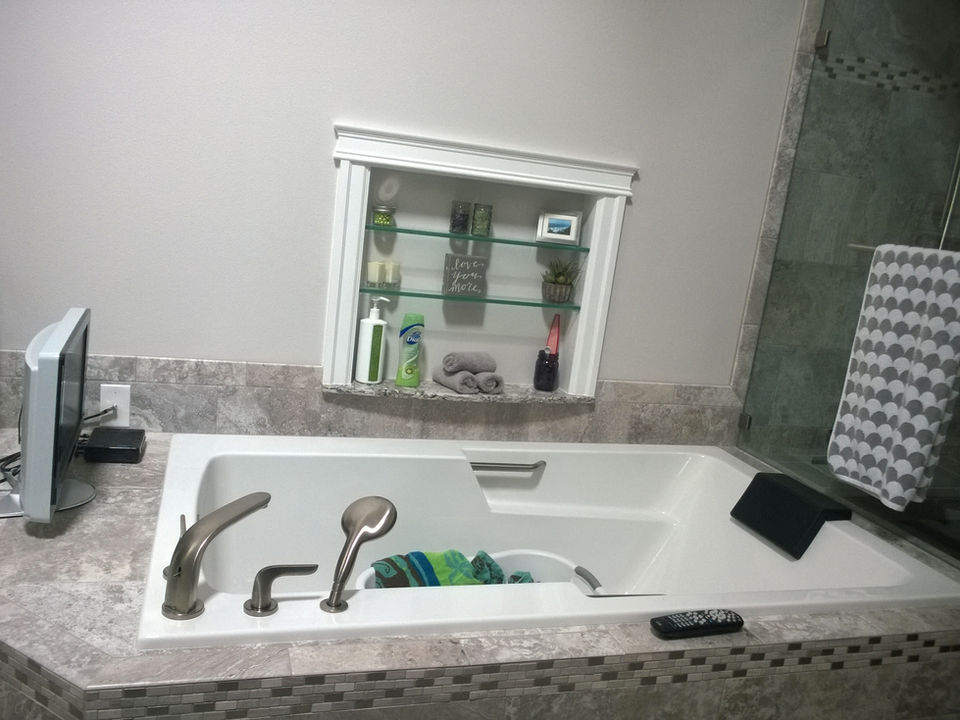 This spacious master bath has plenty of storage space and custom touches including a niche with glass shelves next to the jetted tub and we vaulted the ceiling to 16' utilizing the attic space. Look at the pictures in the gallery below.